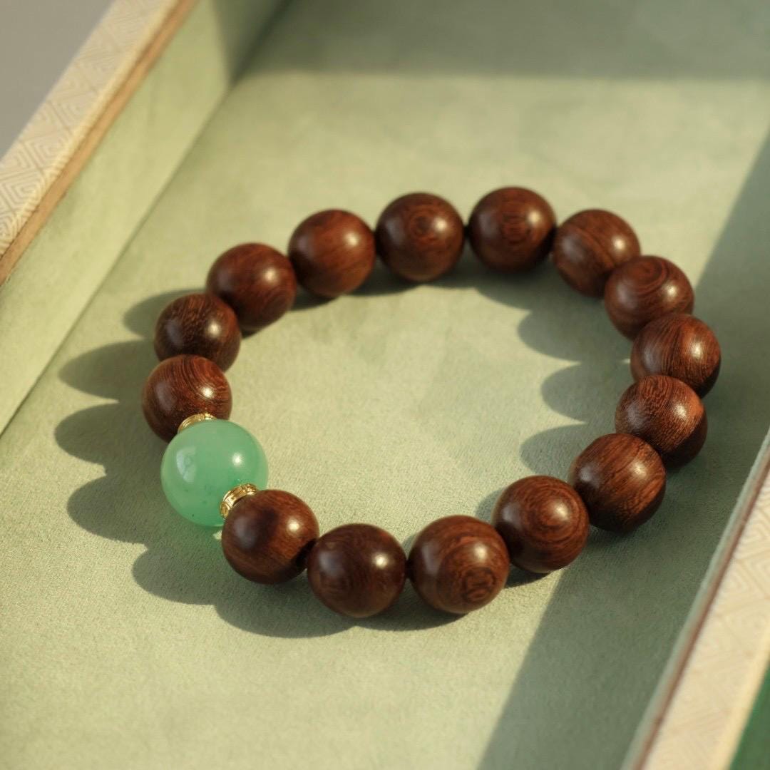 金丝檀木配高品质独龙玉非洲翠,珠子晴底甜绿带翠色飘花,100%有中高端翡翠即视感了