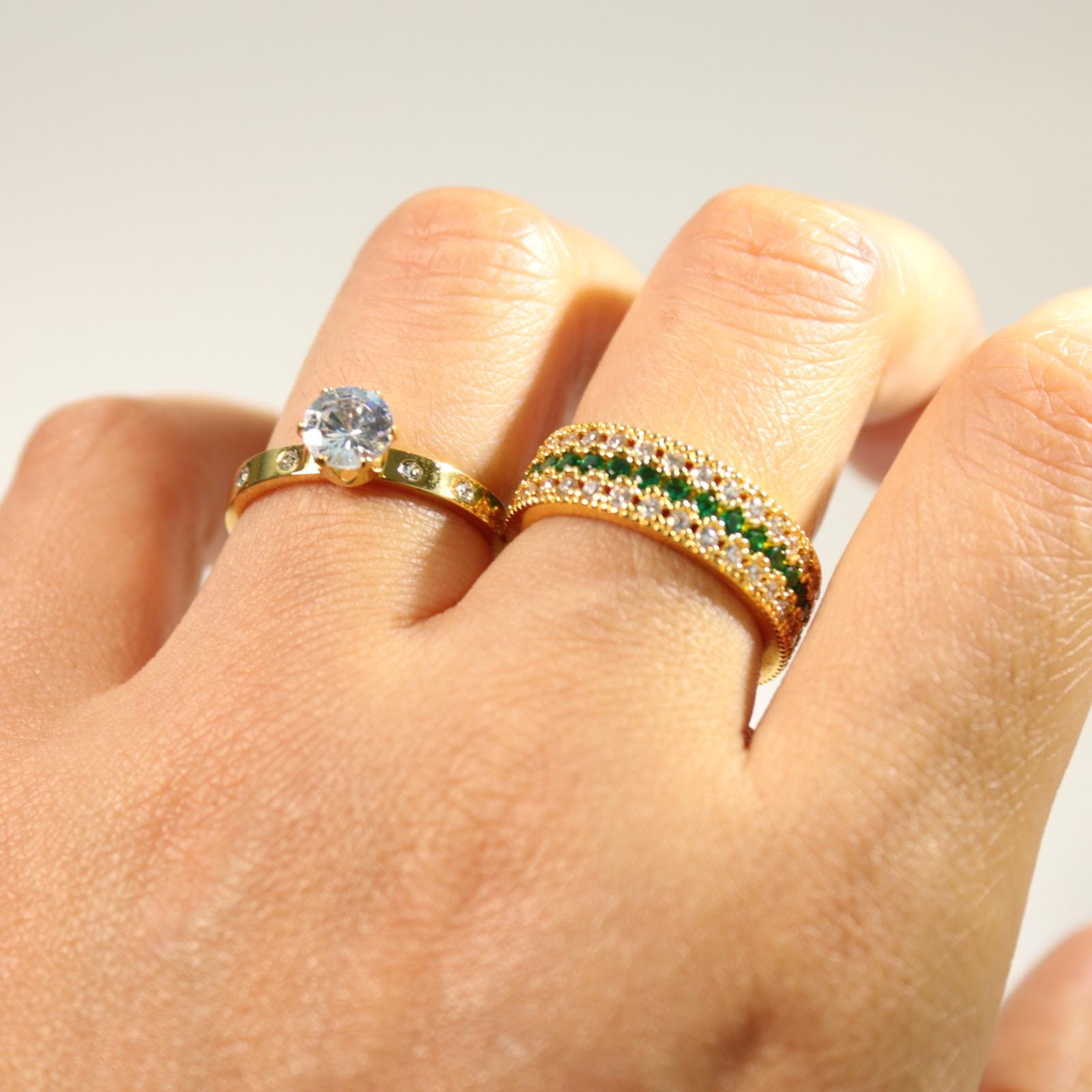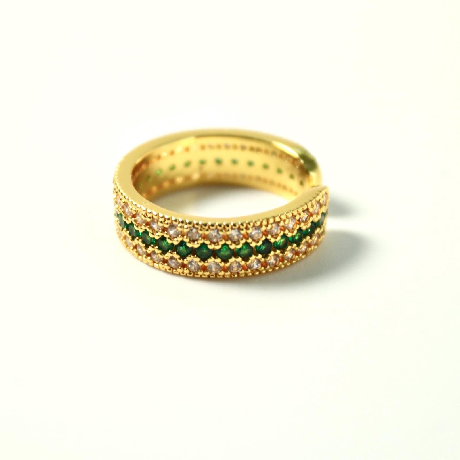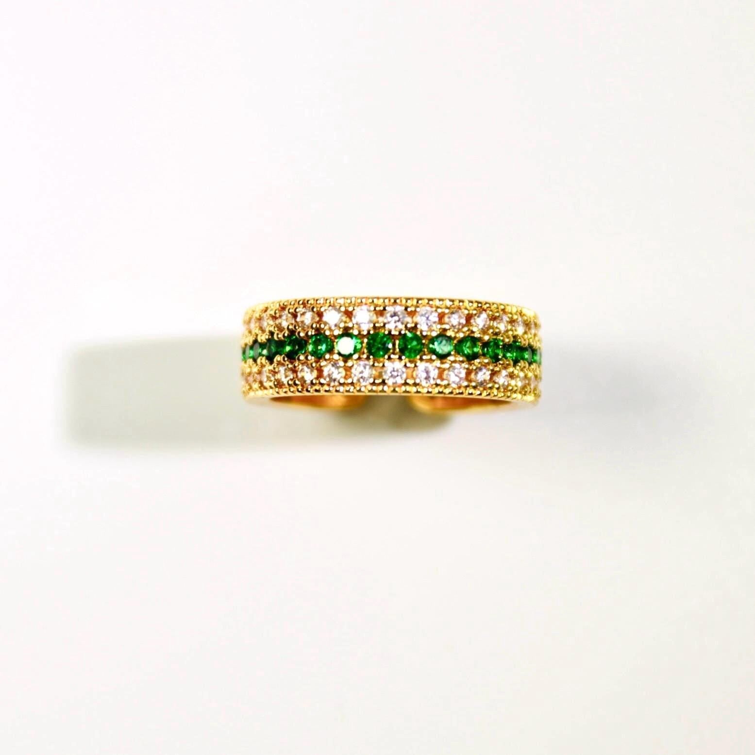 fully set with green and white gemstones. open band design, adjustable up to size 8.