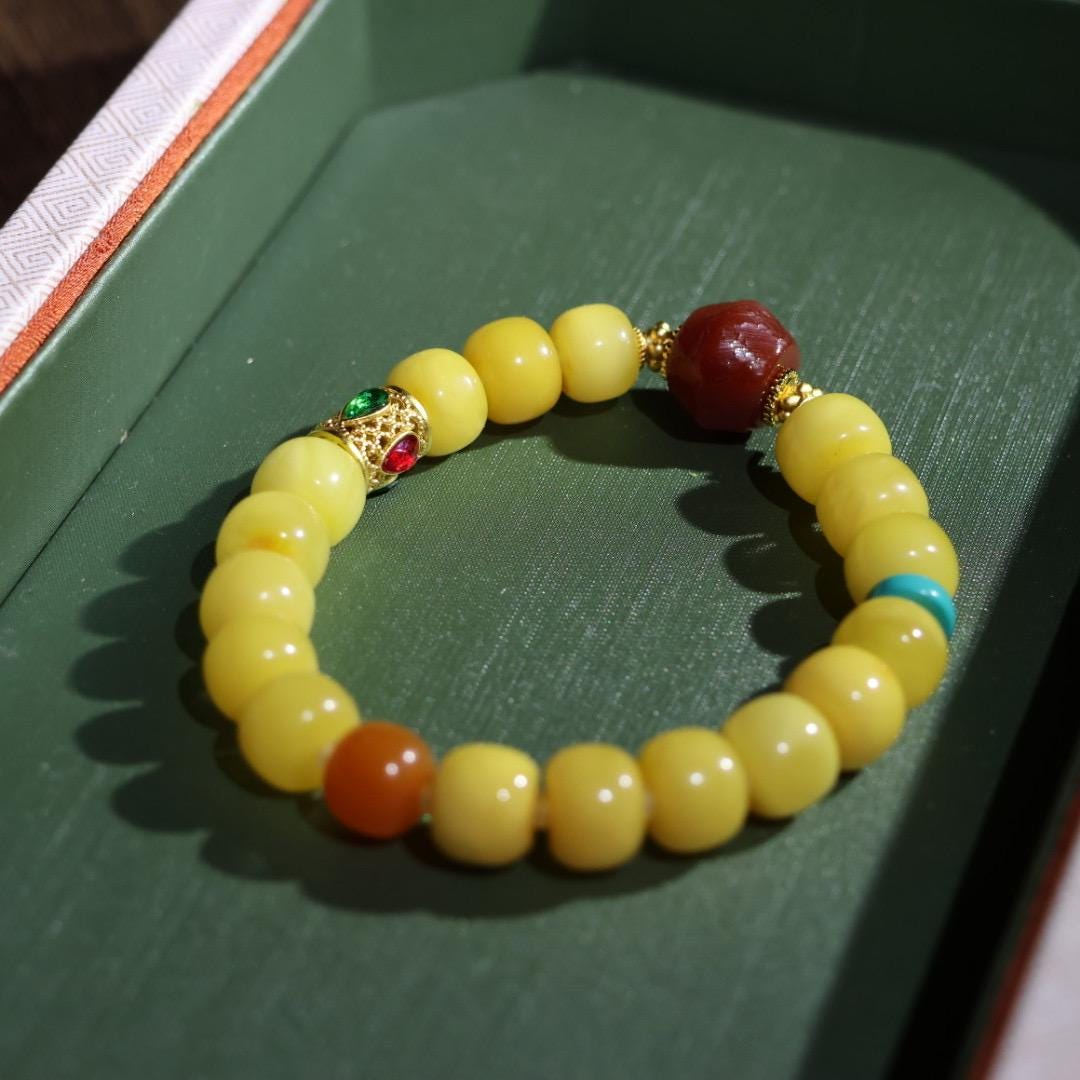 天然直切蜜蜡手串,配搭老玛瑙,铜镀金配件,优化绿松,缅甸黄龙玉All items you purchase from my store are gift ready, that will be shipped in nice gift boxes. For higher end gift box upgrade, you can also search "gift box" in my store and purchase along with your items