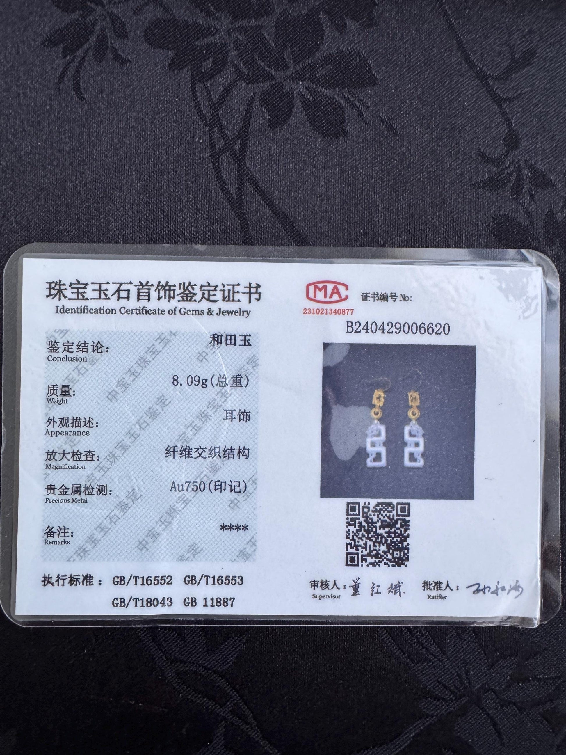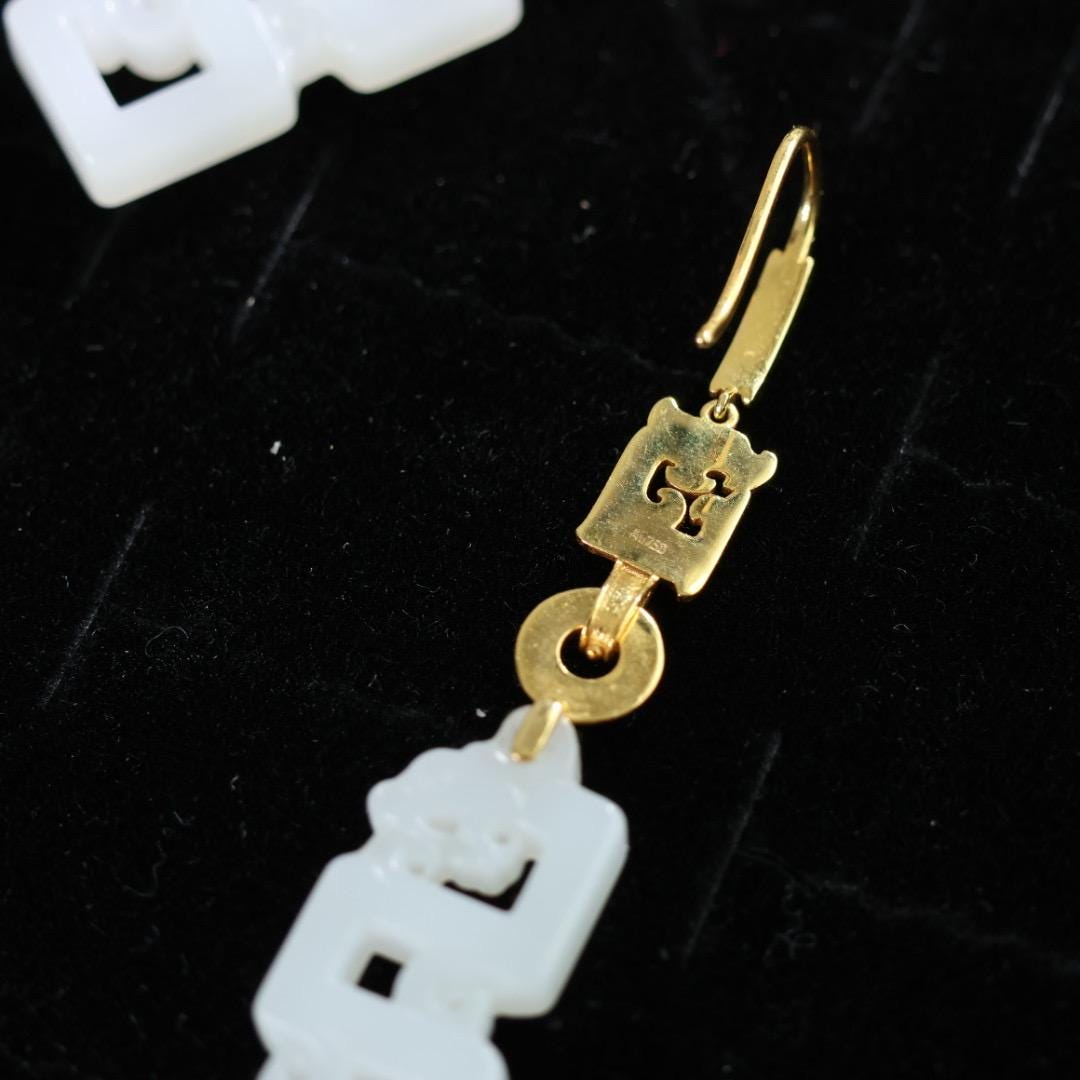 Certified Antique style white nephrite dragon and solid gold earrings 18k
