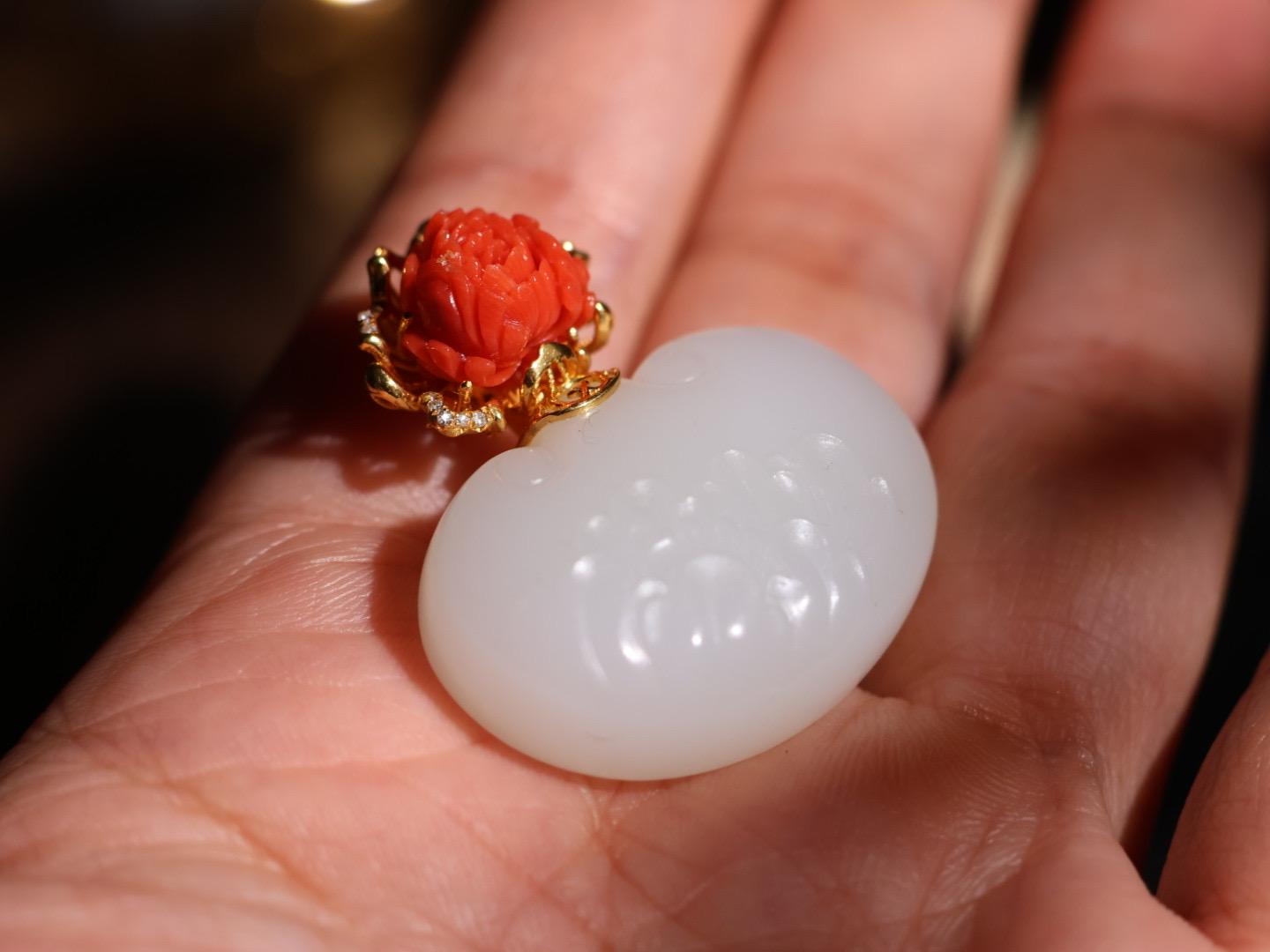 Certified Mutton fat white nephrite coral solid 18K gold peony lock pendant 羊脂白珊瑚牡丹花锁吊坠