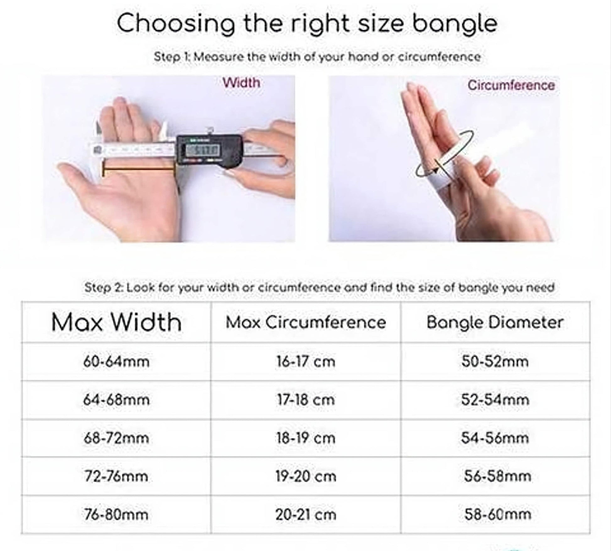 Inner Diameter: 59.5mm/2.35". width 7.5mm please note that the metal bangle can be bent in a small range for fitting.All items you purchase from my store are gift ready, that will be shipped in nice gift boxes. For higher end gift box upgrade, you can also search "gift box" in my store and purchase along with your items