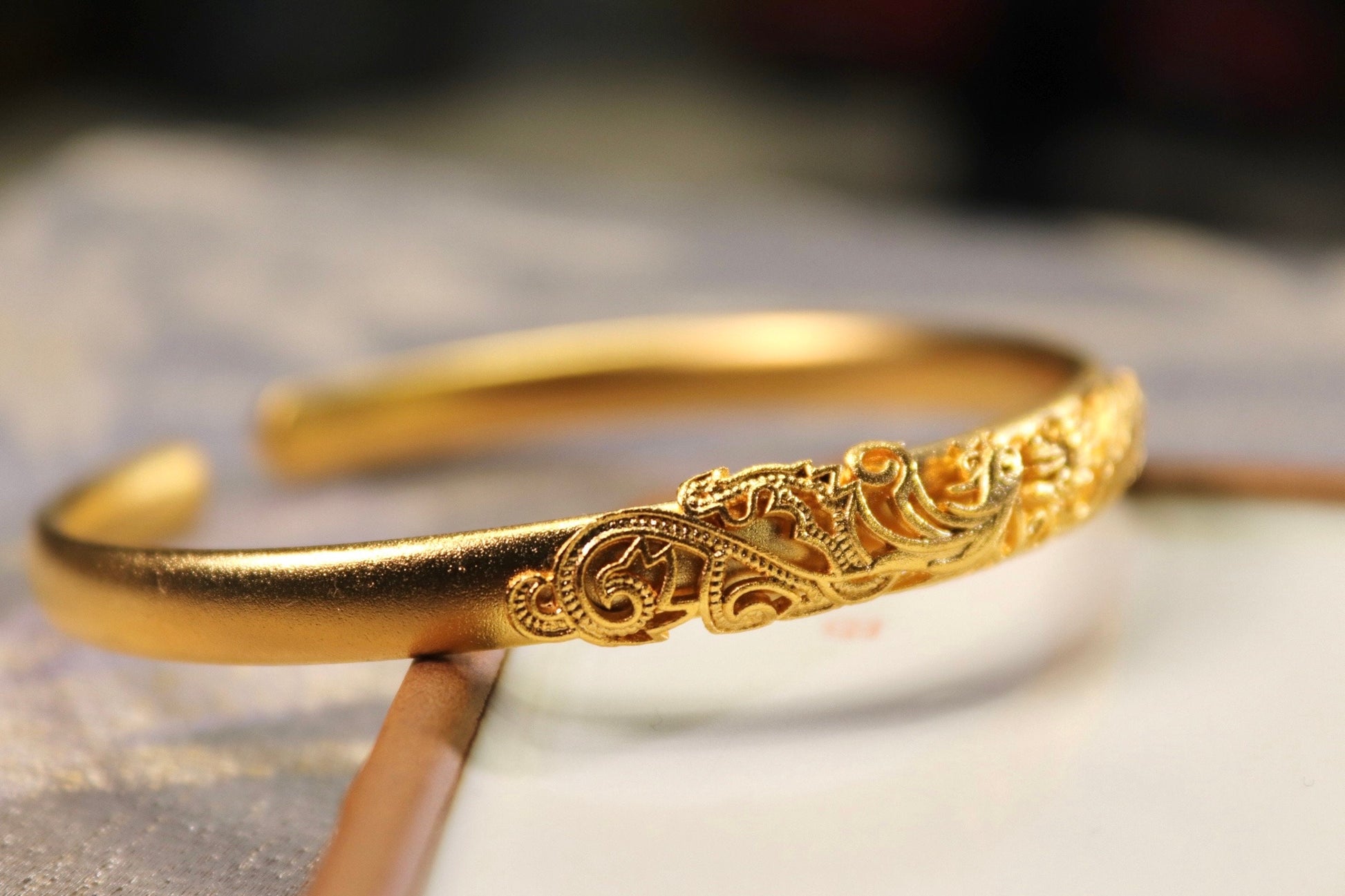 Chinese style dragon and phoenix 24k gold bangle. Chinese Wedding jewelry