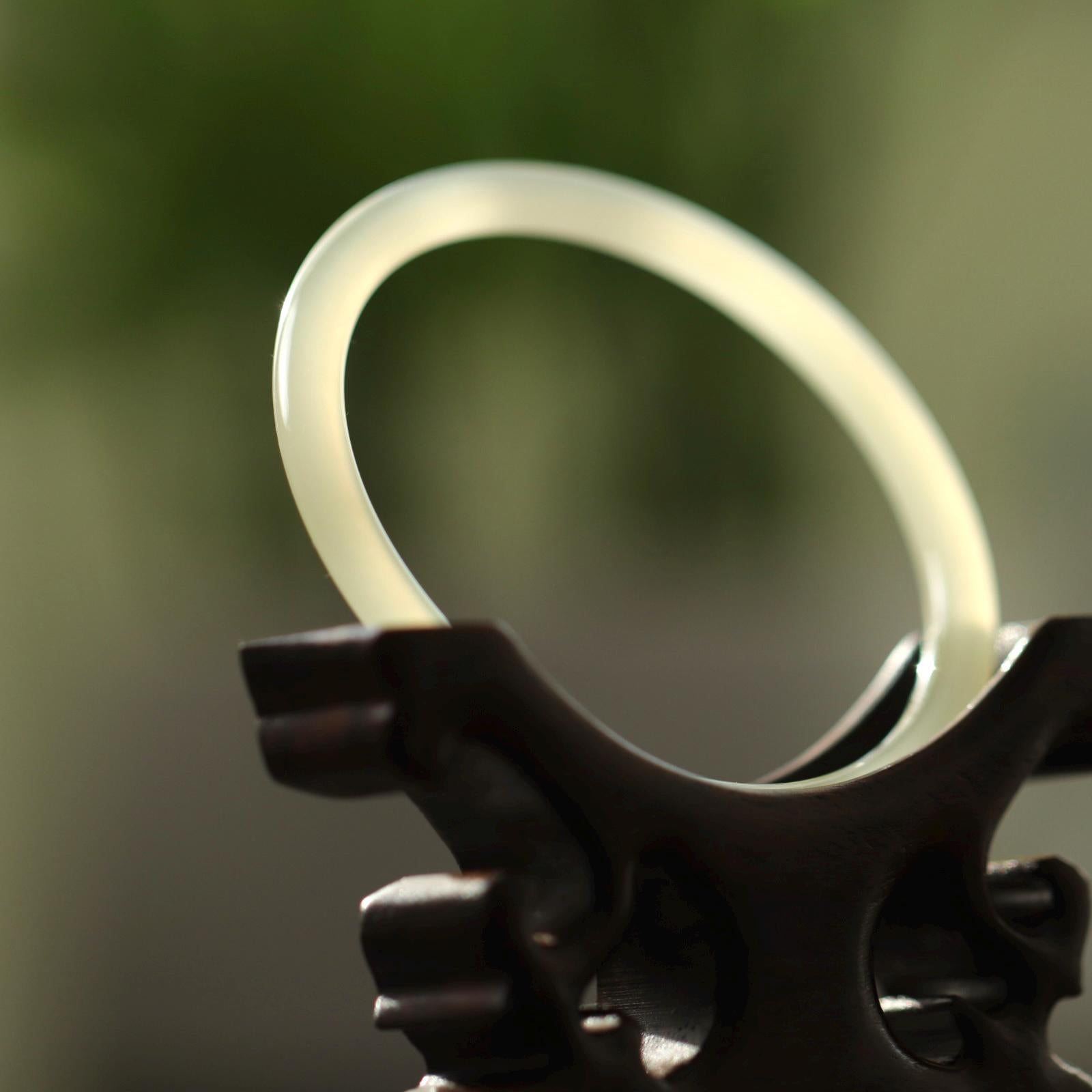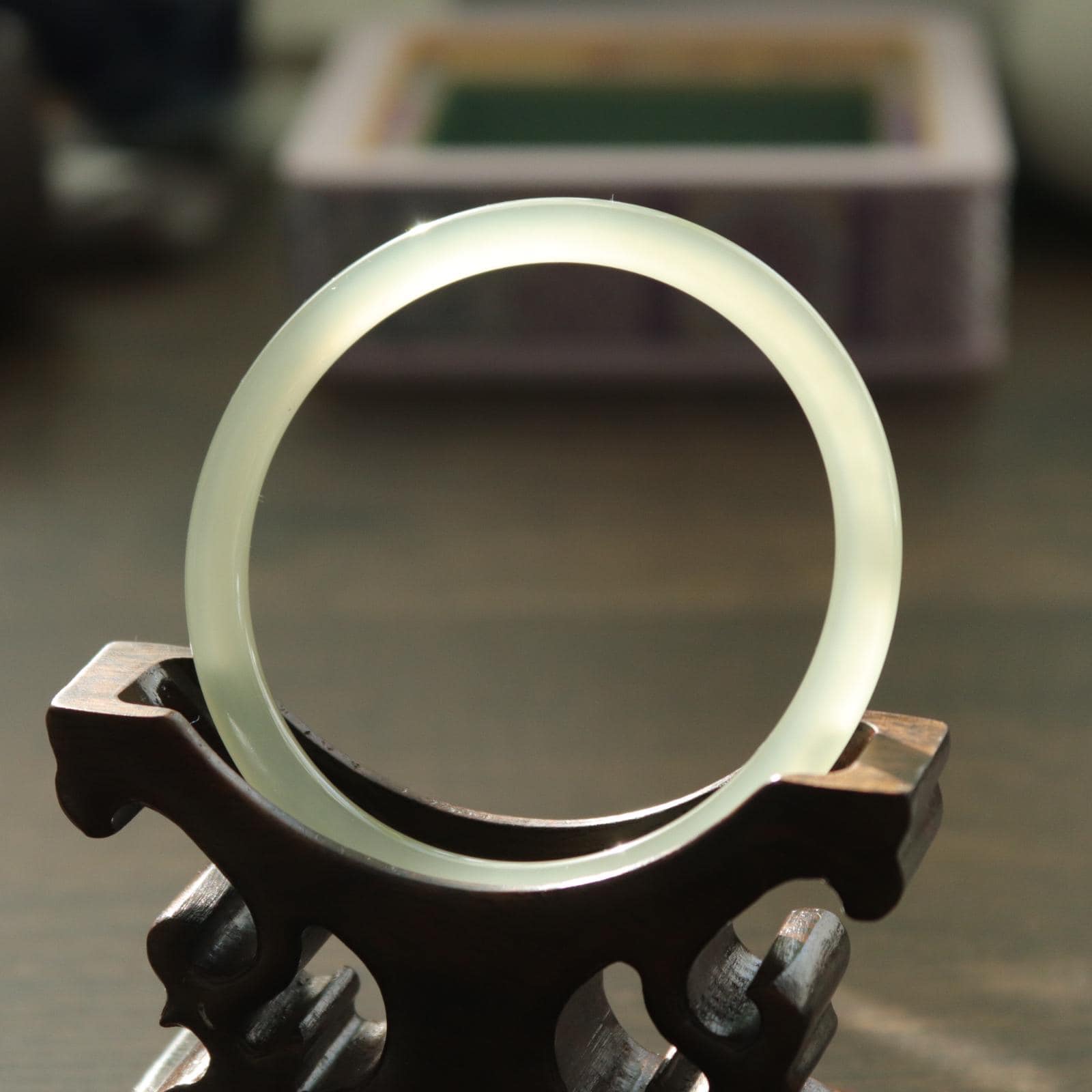 This bangle is made with premium nephrite jade in the shade of light icy green. The jade texture is highly translucent with jelly light texture and inner glow. Dainty but perfect all in all