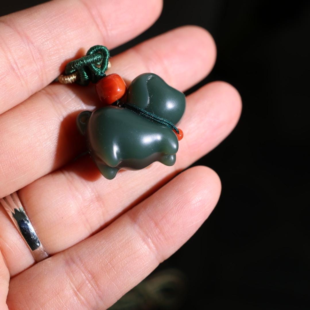 lovely puppy jade pendant, hand carved by well trained master using the highest quality dark green oily nephrite jade, adorned with Nanhong south agate beads. the cord necklace is hand braided.