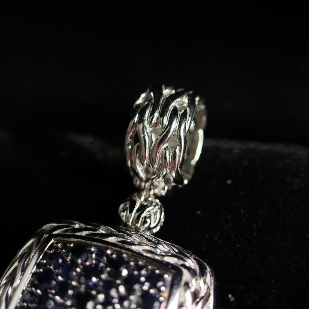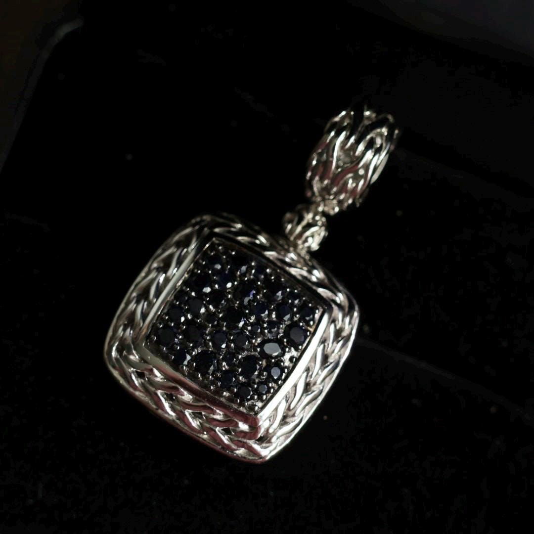 Sparkling black sapphires nest within a sterling silver square pendant framed in a signature basket-weave design. Hardy's Heritage Collection features a curated selection of timeless fine jewelry and iconic designs from the last 40 years.