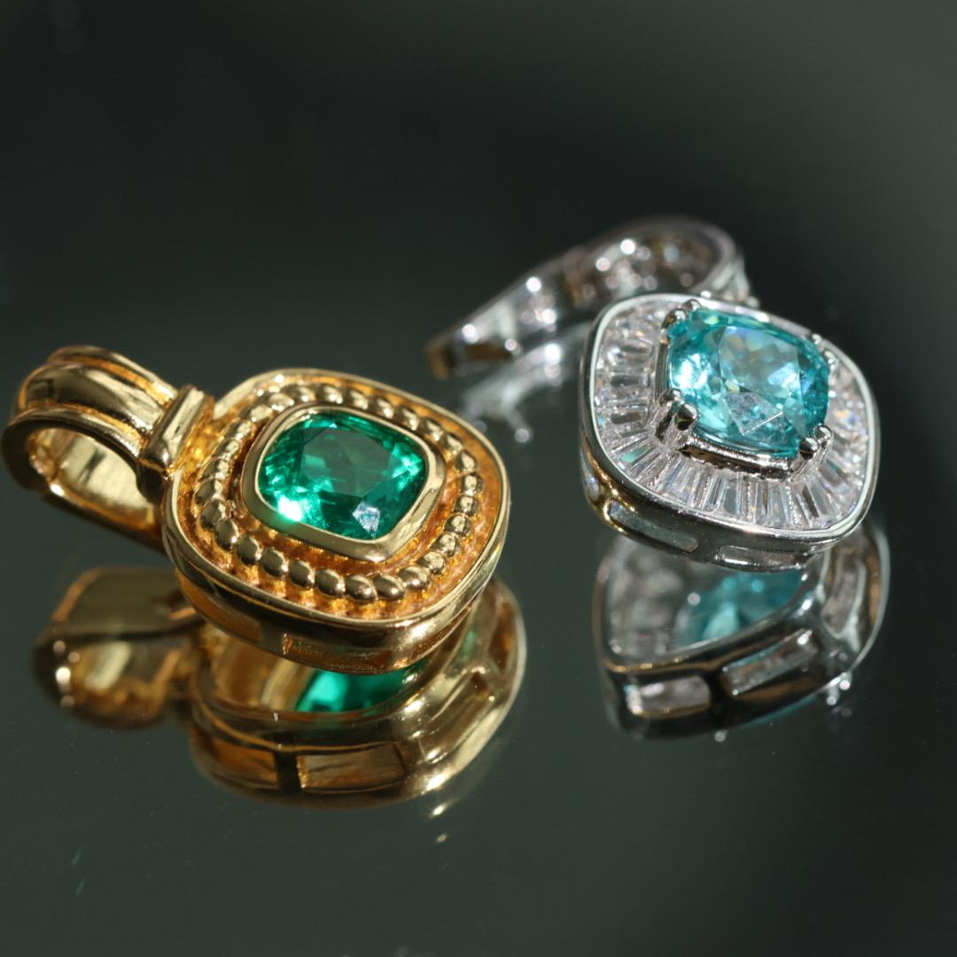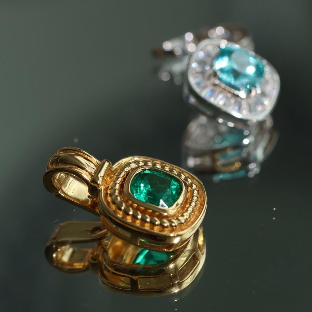 Pre-owned but almost new lab created emerald and paraiba sterling silver pendant. bail can be opened to conveniently go on any chain without issue Sterling silver metal parts paraiba: size: 13.2x 13.2 mm without the bail. 22.6x13.2 with bail hallmark: D:2.55ct, s925 emerald: size: 14.1 x 14.1 mm without the bail. 21.7x14.1 with bail hallmark: E1.15ct, S925. Chain not included.