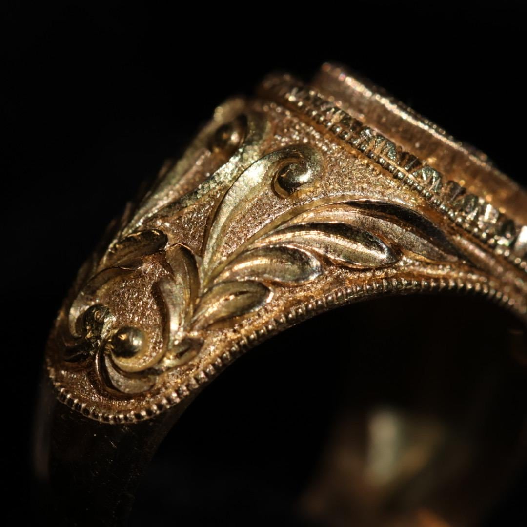 The 18K yellow gold ring is hand chased in high relief with a scrolling foliage
