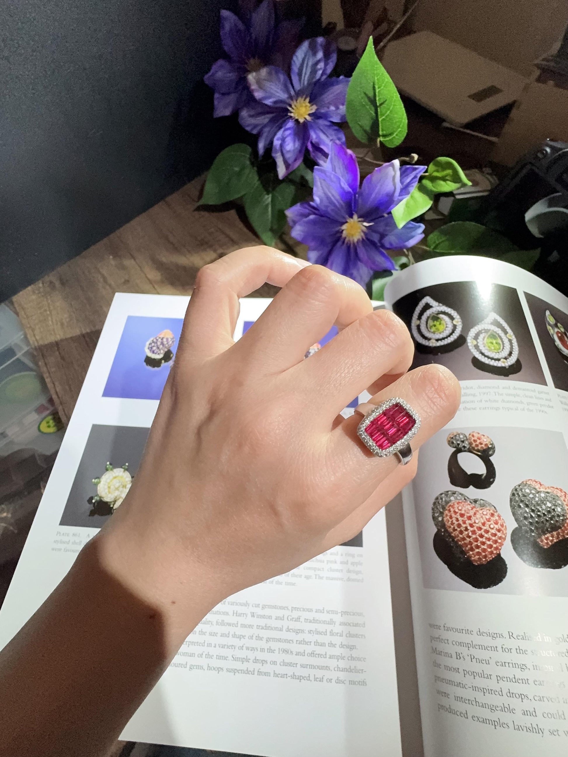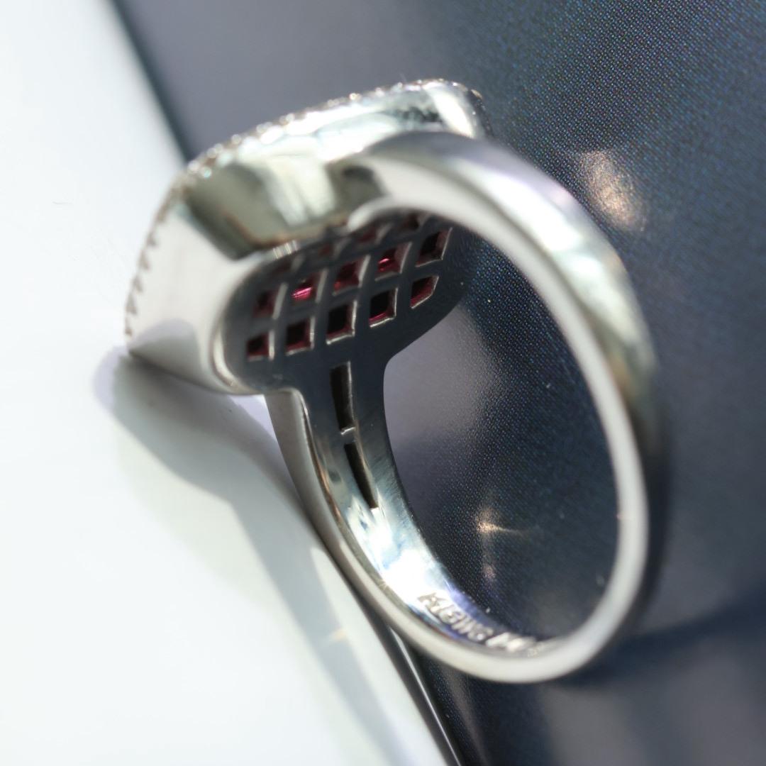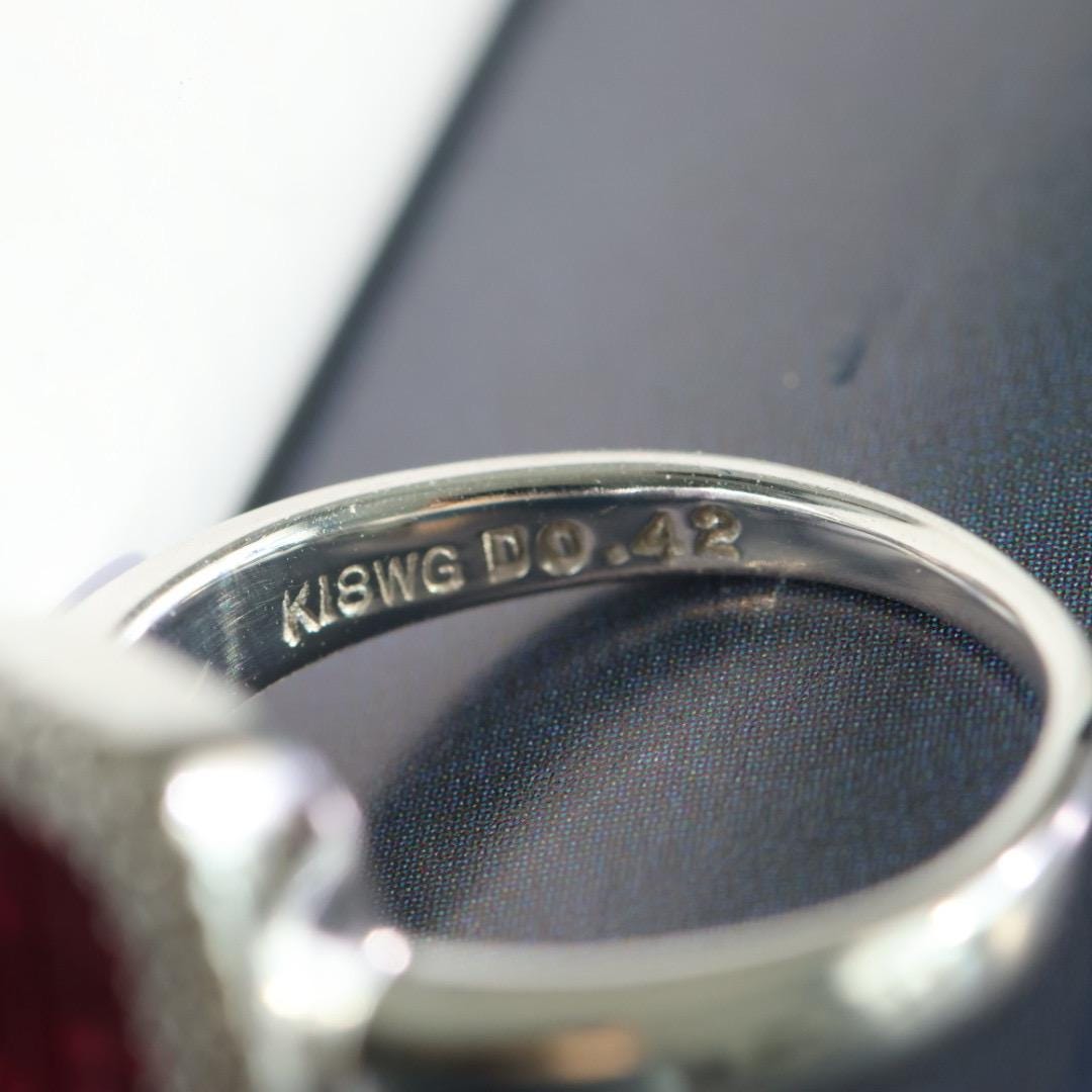The 18K white gold ring is acquired from Japan. it features mystery set Pigeon red ruby with the a total carat weight of 1.53. Side stones are good quality diamonds totaling 0.42ct.