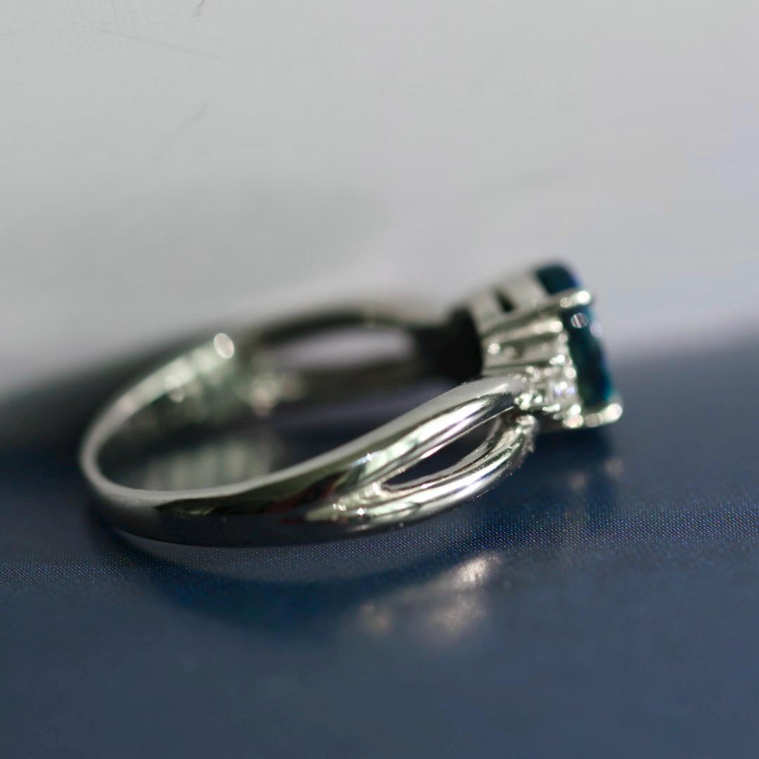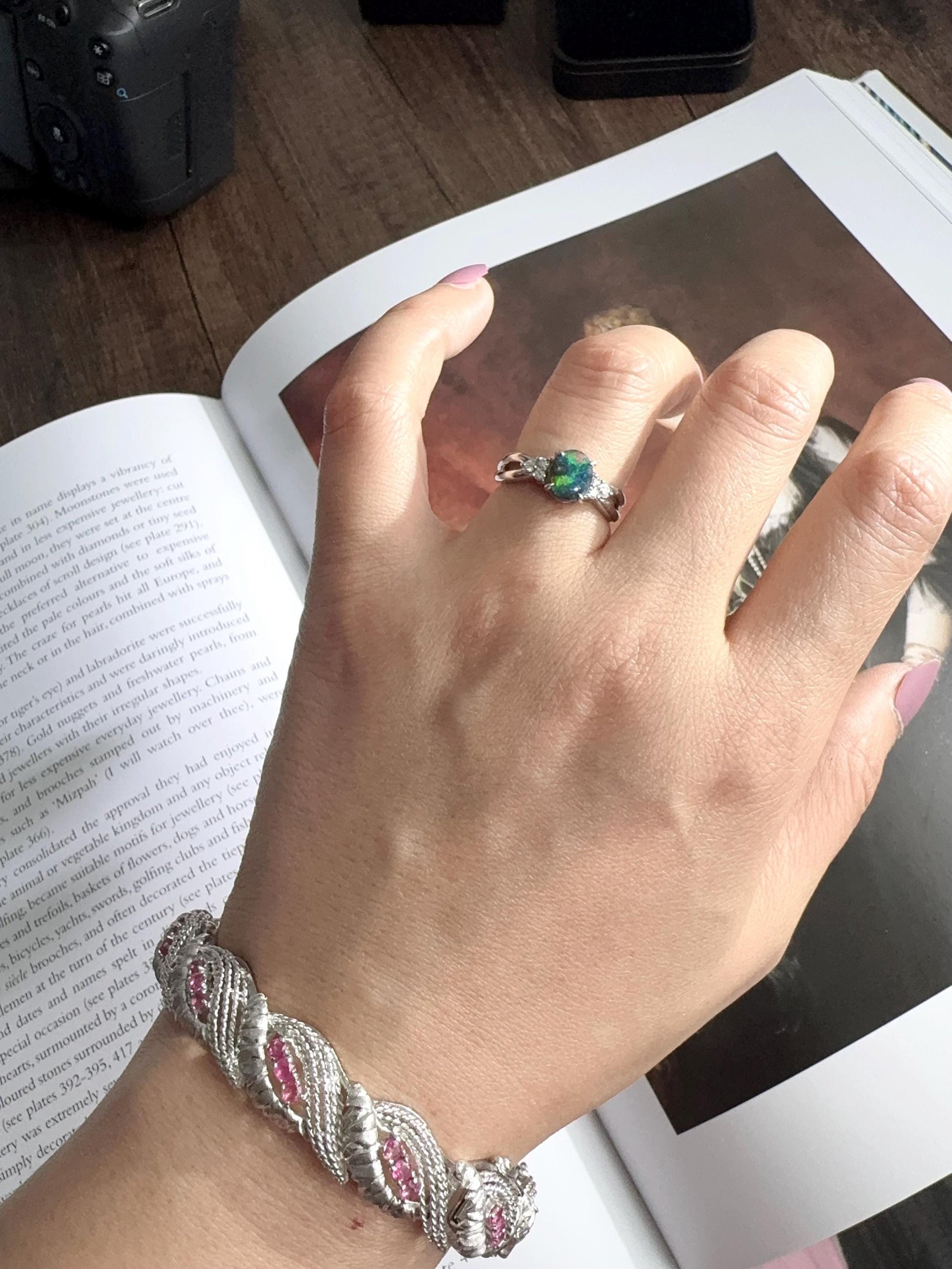 The Tasaki black opal ring is acquired from Japan. it features a full spectrum play of color of the natural Australian black opal of 0.68 ctw. side stones are good quality diamonds totaling 0.09 ct.